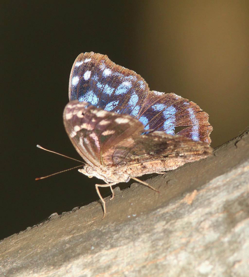 The Mexican Bluewing (Myscelia ethusa) is a medium sized butterfly, with the black upperside marked with blue bands and white spots on the tips. The underside is brown and black, often appearing like a dead leaf.